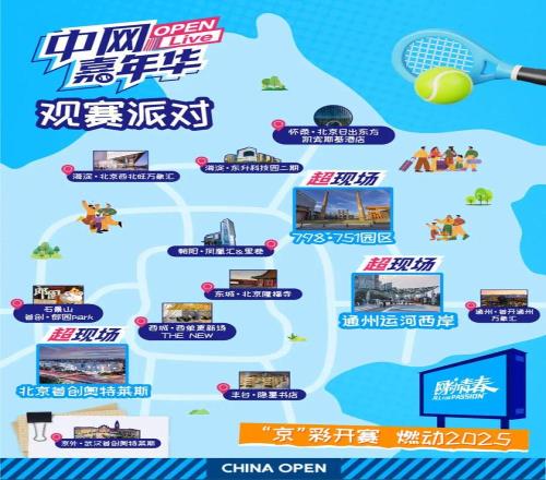2025年9月,中国网球公开赛首次推出“中网嘉年华OpenLive第二现场”计划,以“京彩开赛,燃动2025”为口号,创新打造“观赛派对、商圈互动、影院观赛”三大模式,在全市及京外设立近40个第二现场点位。