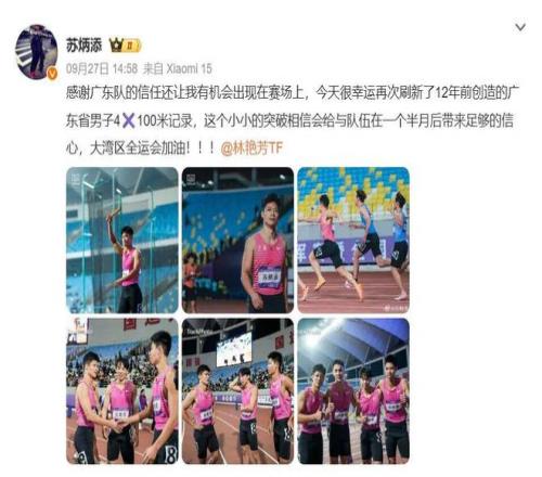 赛后的第二天,苏炳添自己发了一条微博,也提及到接下来的全运会,他说“感谢广东队的信任还让我有机会出现在赛场上,今天很幸运再次刷新了12年前创造的广东省男子4x100米纪录,这个小小的突破相信会给我与队伍在一个半月后带来足够的信心,全运会加油!!!”并且在微博的最后@了他的太太,给大家小秀一下恩爱。