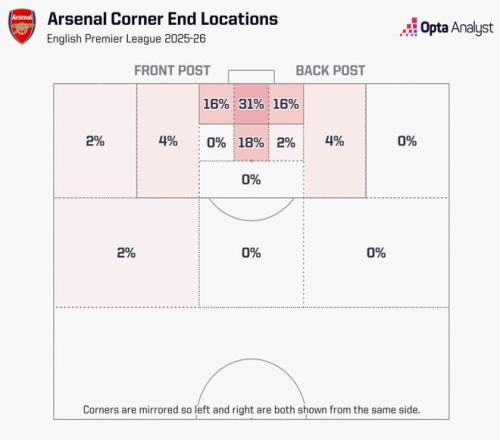 Opta揭秘阿森纳角球:前后点均衡落位,49%角球直袭球门中路