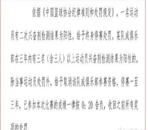 根据CBA的新规定,如果球员在2次兴奋剂检测中呈现阳性,将会被终身禁赛。对于球队(俱乐部),在3年内有3名及以上运动员兴奋剂检测为阳性,则取消该球队(俱乐部)的参赛资格,禁赛期为1-3年,已经参加的比赛全部按照0-20判负,并且收回之前所有的奖项。这样的处罚看起来是非常严重的,显示了CBA总公司和中国篮协反对兴奋剂的决心,也打击了某些球队的违规手段和行为。
