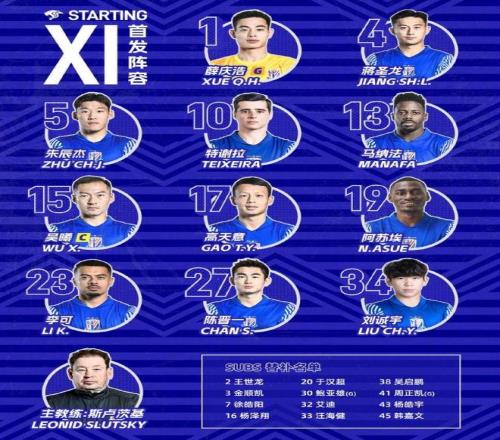 本场比赛,上海申花在首发上派出了1-薛庆浩、4-蒋圣龙、5-朱辰杰、13-马纳法、27-陈晋一、10-特谢拉、15-吴曦、17-高天意、23-李可、19-阿苏埃、34-刘诚宇的阵容。