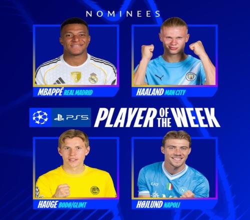 雷速体育10月2报道 欧冠联赛阶段次轮战罢,欧冠官方发布了本轮的最佳球员候选名单,姆巴佩(皇家马德里)、哈兰德(曼城)、海于格(博德闪耀)和霍伊伦(那不勒斯)成功入选。