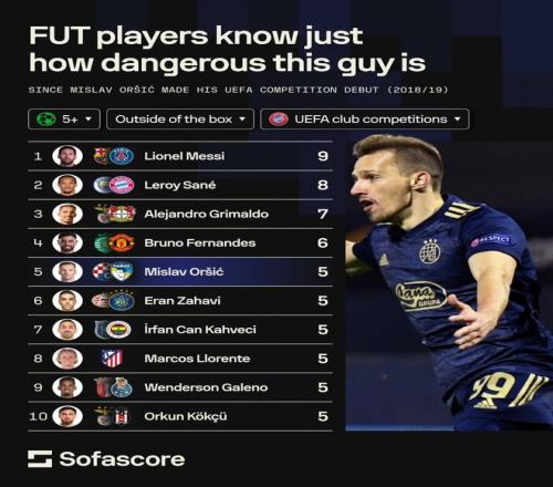 比如Sofascore,他们就给出一个过去8个赛季欧冠禁区外远射进球榜。为什么是过去八年呢?因为这是给刚激活个人里程碑的米斯拉夫·奥尔西奇定制的数据。这也很好说明了梅西的实力,无论给谁定制数据,他都可以是第一、第一档或者独一档。