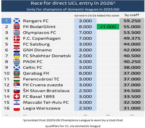 但挪威超级联赛冠军直通欧冠的名额仅适用于博德闪耀。即使维京或莫尔德赢得了联赛冠军,他们仍然需要参加资格赛,因为截至目前为止,他们的有关系数要低得多。目前博德闪耀在少赛一轮的情况下,落后榜首的维京1分。