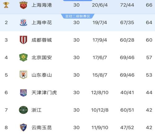 随着海港10大连,泰山+国安皆51,蓉城11,中超收官积分榜出炉