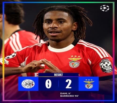 北京时间11月26日01:45,欧冠联赛阶段第5轮,本菲卡客场挑战阿贾克斯。上半场达尔6分钟闪击,下半场克拉森失良机,巴列罗90分钟锁定胜局。最终本菲卡客场2-0战胜阿贾克斯,本菲卡取得本赛季欧冠首胜+终结4连败,阿贾克斯遭遇欧冠5连败。
